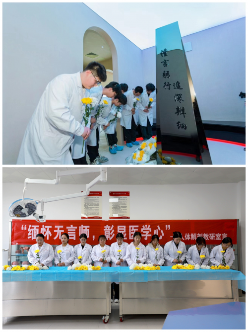 缅怀仪式结束后,在花明书记带领下,师生代表走进我校人体生命科学馆向“无言良师”纪念碑敬献鲜花;医学影像技术专业学生进入人体解剖学第3实验室,向大体老师献花,表达缅怀之情。