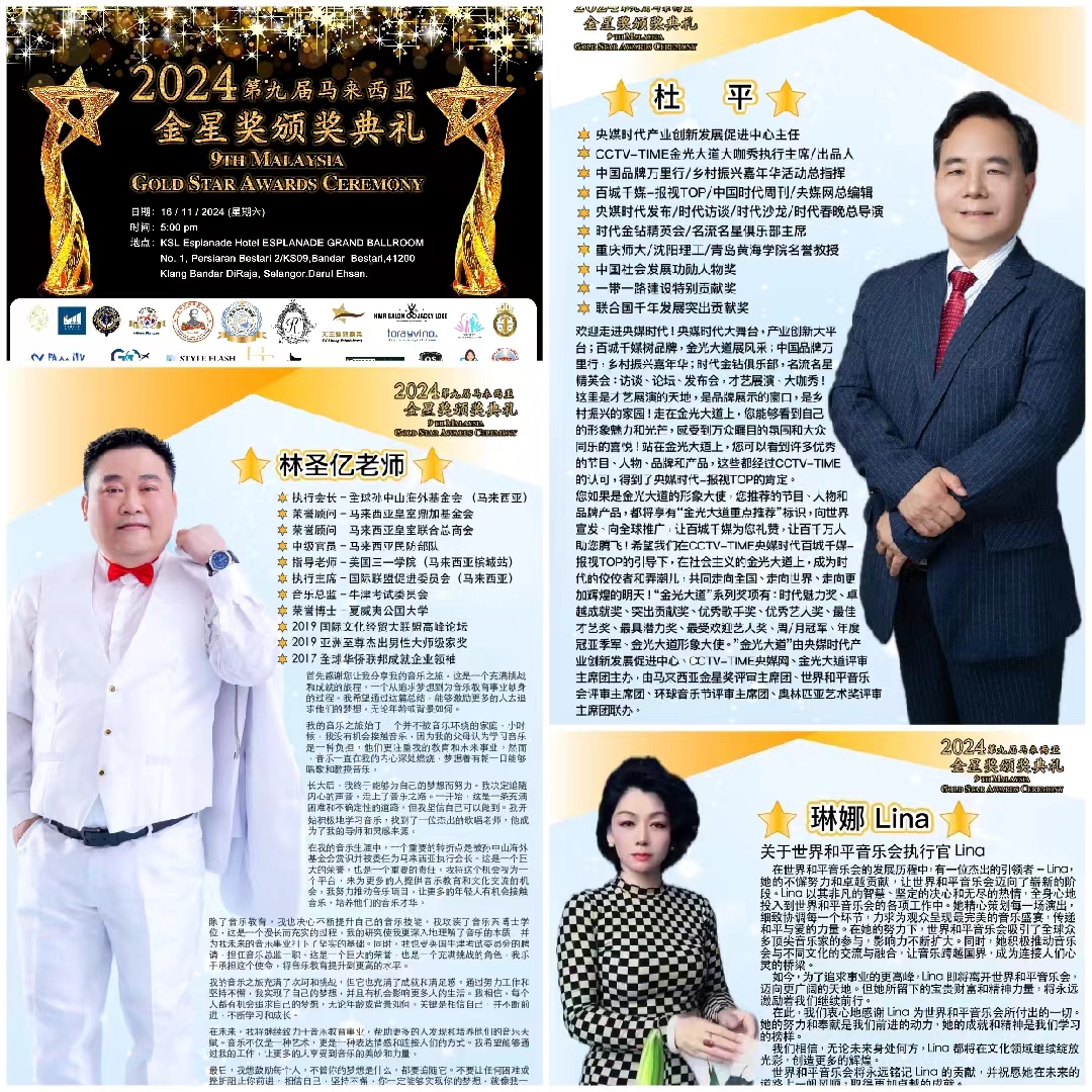 全球金星奖主席林圣亿在活动现场宣布:全球金星奖将于11月16日在马来西亚隆重举行,这次活动将和世界和平音乐会、环球音乐节、奥林匹亚艺术奖、CCTV-TIME央媒时代《金光大道》等机构联办,将表彰全球各地在艺术、音乐、歌舞等方面做出突出贡献的各界人士。(CCTV-TIME央媒网)