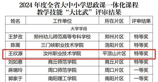 本网讯 近日,全省大中小学思政课一体化课程教学技能“大比武”落幕,经过激烈角逐,汝州职业技术学院思政部教师王欣源在此次比赛中脱颖而出,荣获大学学段特等奖,所在团队荣获二等奖,实现学院在省级教学技能比赛的历史性突破。