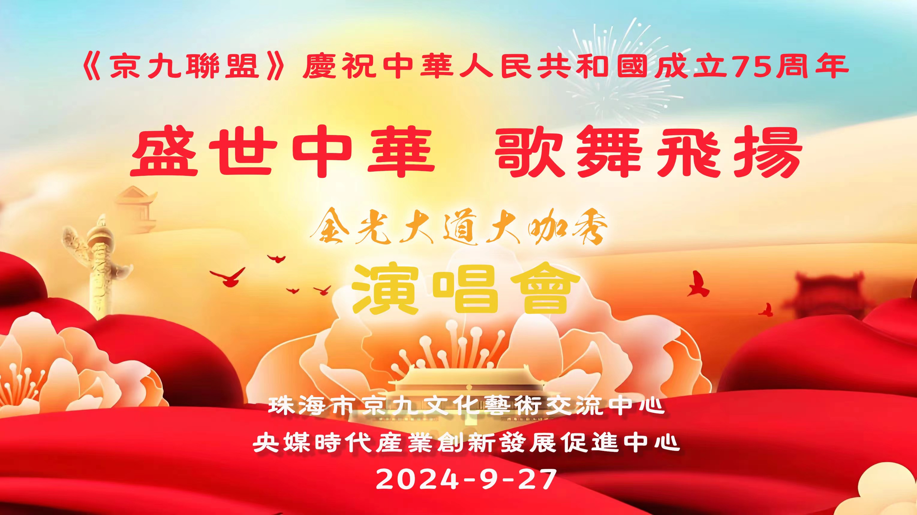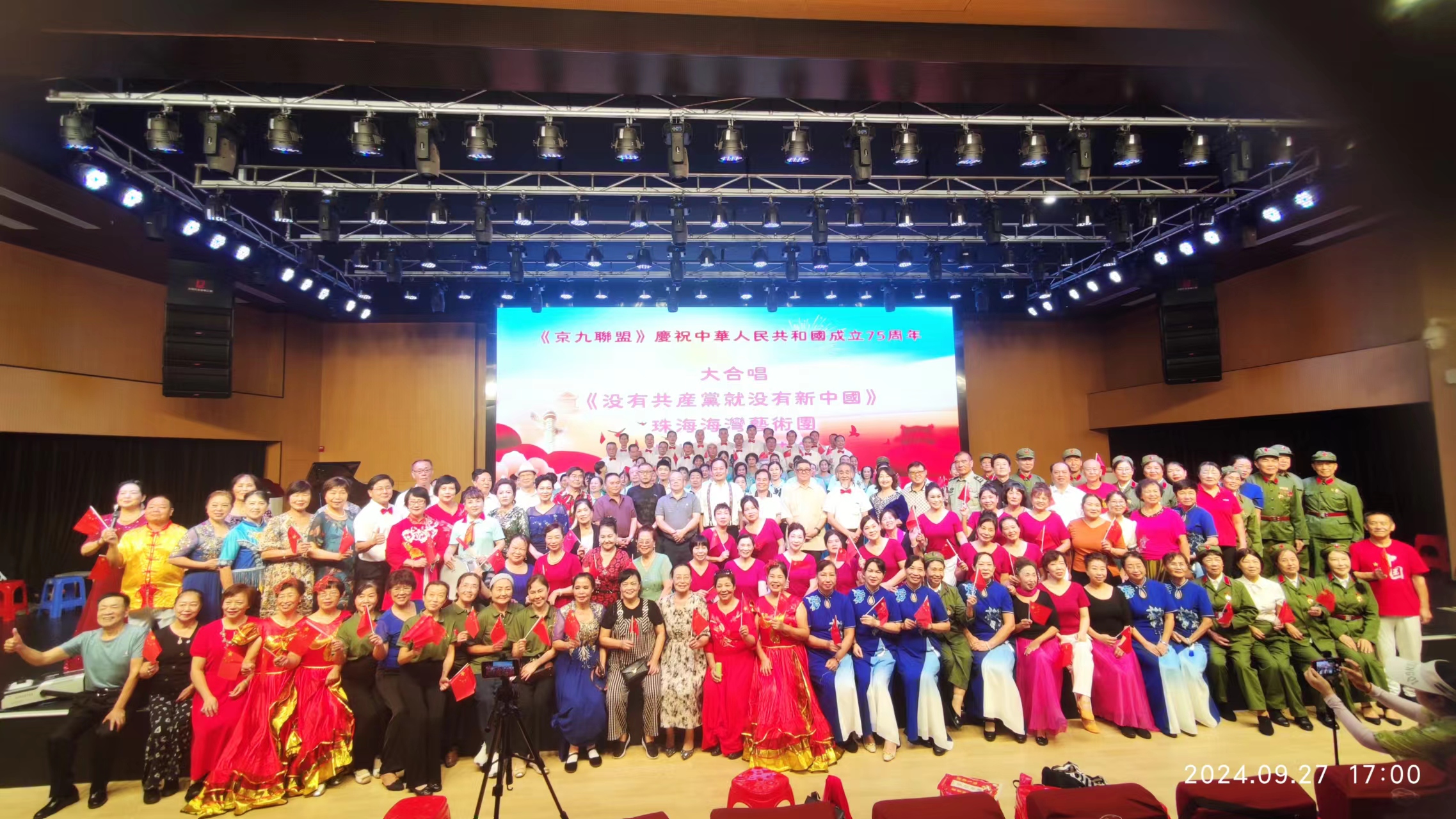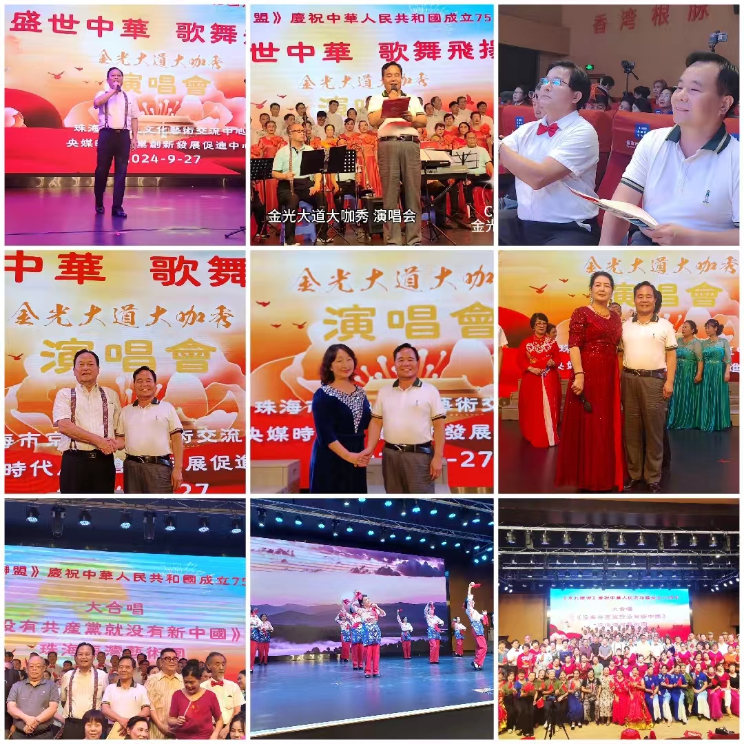 9月27日,由珠海市京九文化艺术交流中心和央媒时代产业创新发展促进中心联合主办的“京九联盟——盛世中华 歌舞飞扬——金光大道大咖秀”在珠海市香湾市民艺术中心演艺厅举行,京九文化艺术交流中心理事长吴焕新致开幕词,CCTV-TIME金光大道大咖秀主席团主席杜平做了重要讲话,珠海市理想管乐团、京九合唱团、海浪艺术团、文珠艺术团、朝 阳 退 役 军 人 艺 术 团、追梦畅响艺术团、海湾艺术团、凤山民乐团、星光退伍兵艺术团、阳光公益艺术团、同仁合艺术团、新香御景艺术团等十多个文艺团体参加了演出,三百多人参加了活动。