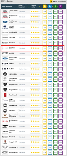 近日,欧洲汽车安全领域的权威机构 Euro NCAP 公布了 2025 年度新车评分,极氪7X获得五星安全认证,2025 年度中型 SUV 领域位居榜首。侧面屏障碰撞和侧面柱碰撞测试中得了满分,遥遥领先于奥迪,福特等品牌车型。极氪 7X 取得如此严苛的碰撞成绩,得益于全车超过 83.3% 的高强度钢运用以及侧面单根行业最长 2.35 米 2000MPa 超长一体成型热气胀刚柱的极氪金箍棒。