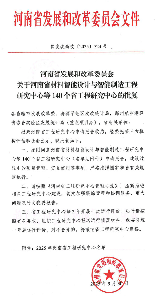 本网讯 近日,河南省发展和改革委员会发布《关于河南省材料智能设计与智能制造工程研究中心等140个省工程研究中心的批复》(豫发改高技〔2025〕724号),正式公布2025年度河南省工程研究中心认定名单。由河南测绘职业学院牵头申报的“河南省智能国土低空协同感知工程研究中心”成功获批立项。该中心是河南测绘职业学院首次获批由省发改委组织实施的省级自主创新平台,标志着学校在省级科研平台建设方面取得又一重大突破。